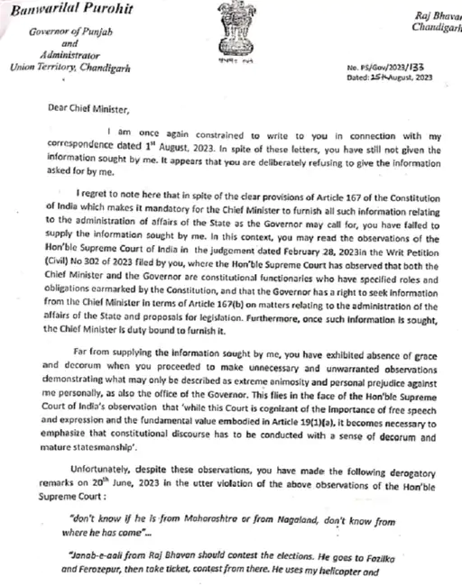 ਮੁੱਖ ਮੰਤਰੀ ਦੇ ਇਸ ਵਤੀਰੇ ‘ਤੇ ਉਨ੍ਹਾਂ ਕੋਲ ਕਾਨੂੰਨ ਅਤੇ ਸੰਵਿਧਾਨ ਅਨੁਸਾਰ ਕਾਰਵਾਈ ਕਰਨ ਤੋਂ ਇਲਾਵਾ ਹੋਰ ਕੋਈ ਚਾਰਾ ਨਹੀਂ ਬਚਿਆ ਹੈ। ਪੰਜਾਬ ਵਿੱਚ ਮੁੱਖ ਮੰਤਰੀ ਭਗਵੰਤ ਮਾਨ ਦੀ ਅਗਵਾਈ ਵਿੱਚ ਆਮ ਆਦਮੀ ਪਾਰਟੀ (ਆਪ) ਦੀ ਸਰਕਾਰ ਹੈ। ਰਾਜਪਾਲ ਨੇ ਮੁੱਖ ਮੰਤਰੀ ਨੂੰ ਕਿਹਾ ਹੈ ਕਿ ਜੇਕਰ ਉਹ ਗਵਰਨਰ ਹਾਊਸ ਦੇ ਪੱਤਰਾਂ ਦਾ ਜਵਾਬ ਨਹੀਂ ਦਿੰਦੇ ਹਨ ਤਾਂ ਉਨ੍ਹਾਂ ਵਿਰੁੱਧ ਕਾਰਵਾਈ ਕੀਤੀ ਜਾਵੇਗੀ।