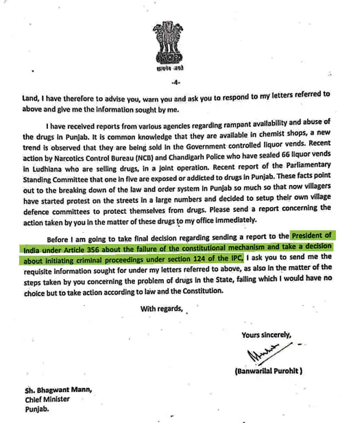 ਰਾਜਪਾਲ ਨੇ 15 ਅਗਸਤ ਨੂੰ ਭਗਵੰਤ ਮਾਨ ਨੂੰ ਇਹ 4 ਪੰਨਿਆਂ ਦੀ ਚਿੱਠੀ ਲਿਖੀ ਸੀ, ਜੋ ਹੁਣ ਸਾਹਮਣੇ ਆ ਗਈ ਹੈ। ਮੁੱਖ ਮੰਤਰੀ ਨੂੰ ਲਿਖੇ ਪੱਤਰ ‘ਚ ਰਾਜਪਾਲ ਬੀ.ਐੱਲ. ਪੁਰੋਹਿਤ ਨੇ ਕਿਹਾ ਕਿ ਪੰਜਾਬ ‘ਚ ਨਸ਼ਾ ਆਪਣੇ ਸਿਖਰ ‘ਤੇ ਹੈ। ਏਜੰਸੀਆਂ ਦੀਆਂ ਰਿਪੋਰਟਾਂ ਅਨੁਸਾਰ ਸੂਬੇ ਦੇ ਡਰੱਗ ਸਟੋਰਾਂ ‘ਤੇ ਵੀ ਨਸ਼ੀਲੇ ਪਦਾਰਥ ਉਪਲਬਧ ਹਨ।