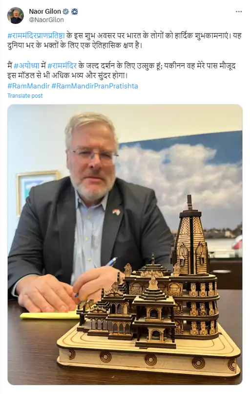 ਇਸ ਦੇ ਨਾਲ ਹੀ ਨਿਊਯਾਰਕ ਦੇ ਟਾਈਮਜ਼ ਸਕੁਏਅਰ ‘ਤੇ ਵੀ ਜਸ਼ਨ ਸ਼ੁਰੂ ਹੋ ਗਏ ਹਨ। ਉੱਥੇ ਲੋਕ ਭਗਵਾਨ ਰਾਮ ਦੇ ਬੋਰਡਾਂ ਦੇ ਨਾਲ ਜੈ ਸ਼੍ਰੀ ਰਾਮ ਦੇ ਨਾਅਰੇ ਲਗਾ ਰਹੇ ਹਨ। ਉੱਥੇ ਹੀ, ਅਯੁੱਧਿਆ ‘ਚ ਰਾਮ ਲੱਲਾ ਦੇ ਪੁਜਾਰੀ ਪ੍ਰੋਗਰਾਮ ‘ਚ 55 ਦੇਸ਼ਾਂ ਦੇ 100 ਰਾਜਦੂਤ-ਸੰਸਦ ਮੈਂਬਰ ਵੀ ਹਿੱਸਾ ਲੈਣਗੇ। ਭਾਰਤ ਵਿੱਚ ਇਜ਼ਰਾਈਲ ਦੇ ਰਾਜਦੂਤ ਨਾਓਰ ਗਿਲਨ ਨੇ ਹਿੰਦੀ ਵਿੱਚ ਟਵੀਟ ਕਰਕੇ ਰਾਮ ਮੰਦਰ ਦੀ ਵਧਾਈ ਦਿੱਤੀ ਹੈ।